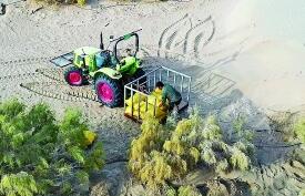 “只要水跟得上,这些梭梭树苗的成活率能在85%以上。”沙雅县胡杨林保护中心副主任王开彦说,栽植用的水是来自沙漠地下的苦咸水,适合梭梭生长。“梭梭种下前5年需要人工给水,待根系扎入深层后,可以实现自给供水,有着非常好的固沙效果。”